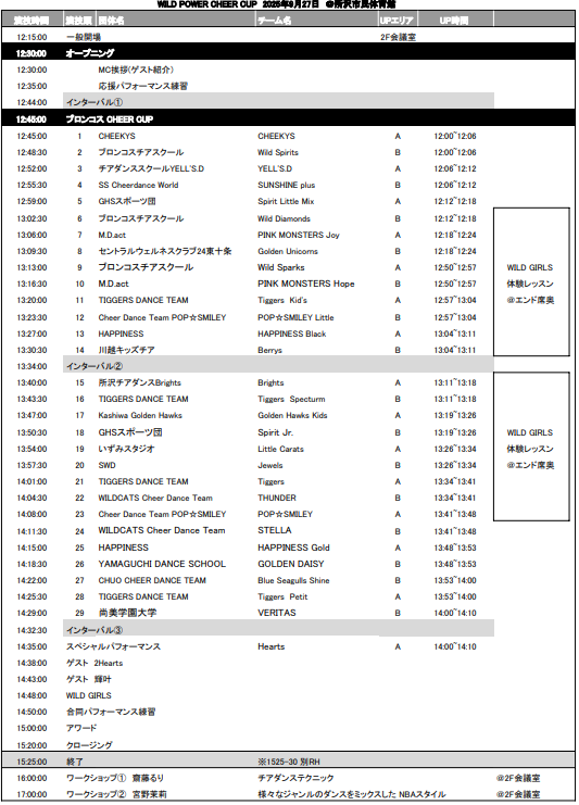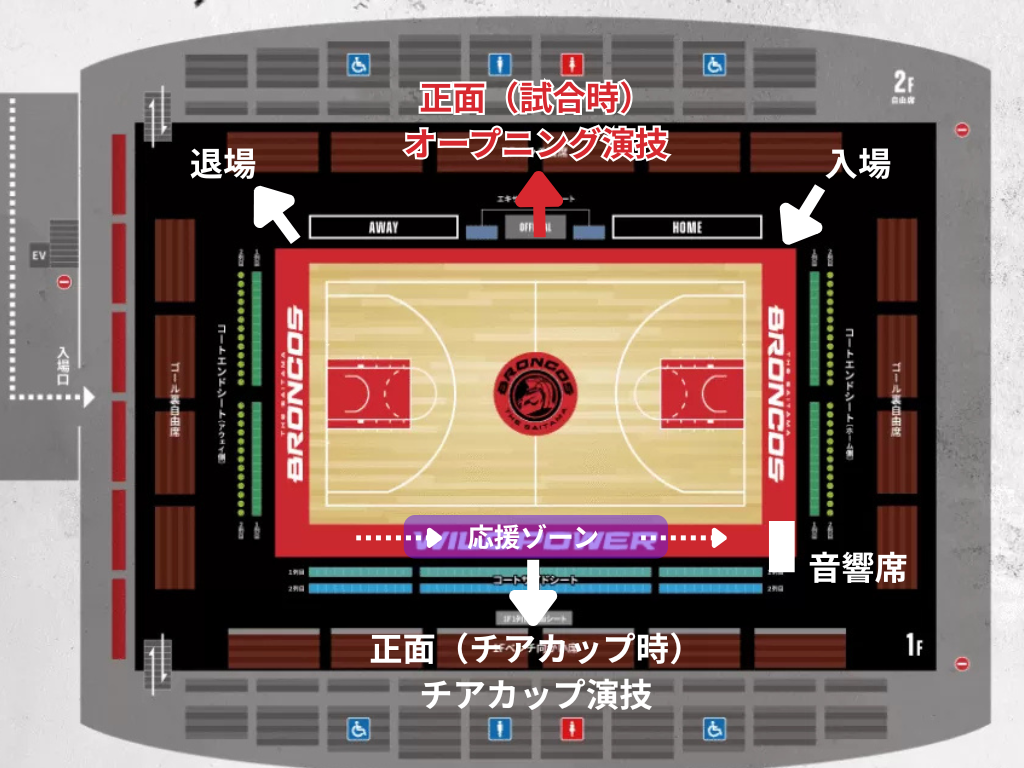 11:30 受付開始(チーム) 12:00 一般入場 12:45 オープニング 13:00 演技(コンテスト) 1団体4分x20チーム 14:30 ゲスト演技 15:00 アワード(&WGコラボダンス) 15:40 終了 ※会場外に退出可能(再入場可) 17:00 開幕戦選手 ウォームアップ開始 18:20 オープニング 合同ダンス披露 19:00 さいたまブロンコス開幕戦 試合開始 20:45 試合終了 写真撮影(保護者・関係者は退場) ※スケジュールはエントリーチーム数によって変更の可能性がありますのでご了承ください。 ※演技前のアップはアップ会場を用意します。 ※上記以外の詳細スケジュールは後日ご案内いたします。 |